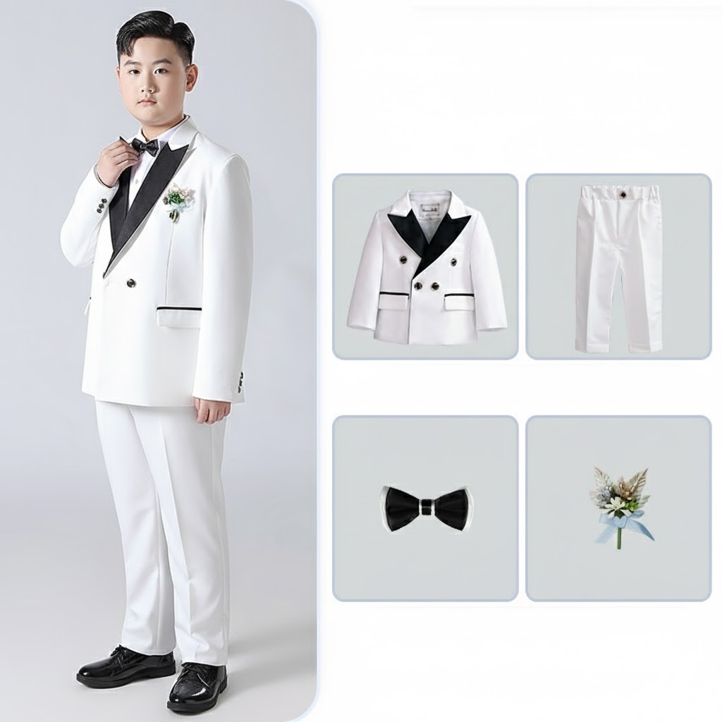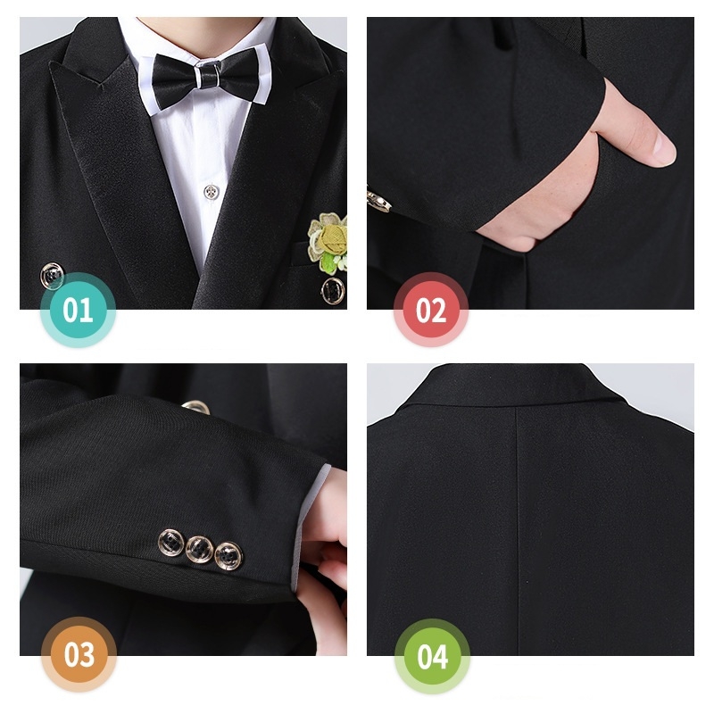 Bộ gồm 4 chi tiết : 1 áo Vest + 1 Quần tây + 1 nơ + 1 ghim cài áo (Không bao gồm áo Sơ mi)