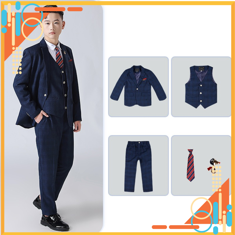 Bộ gồm 5 chi tiết : 1 áo Vest + 1 áo ghile + 1 Quần tây + 1 cavat + 1 ghim cài áo (Không bao gồm áo Sơ mi)