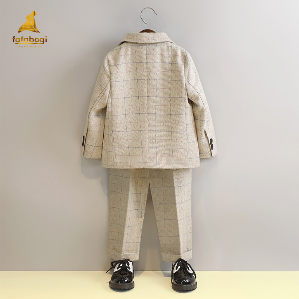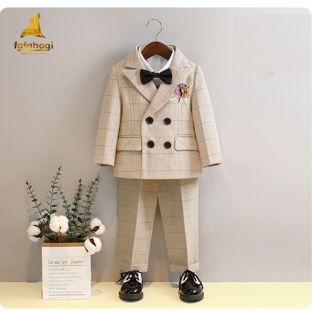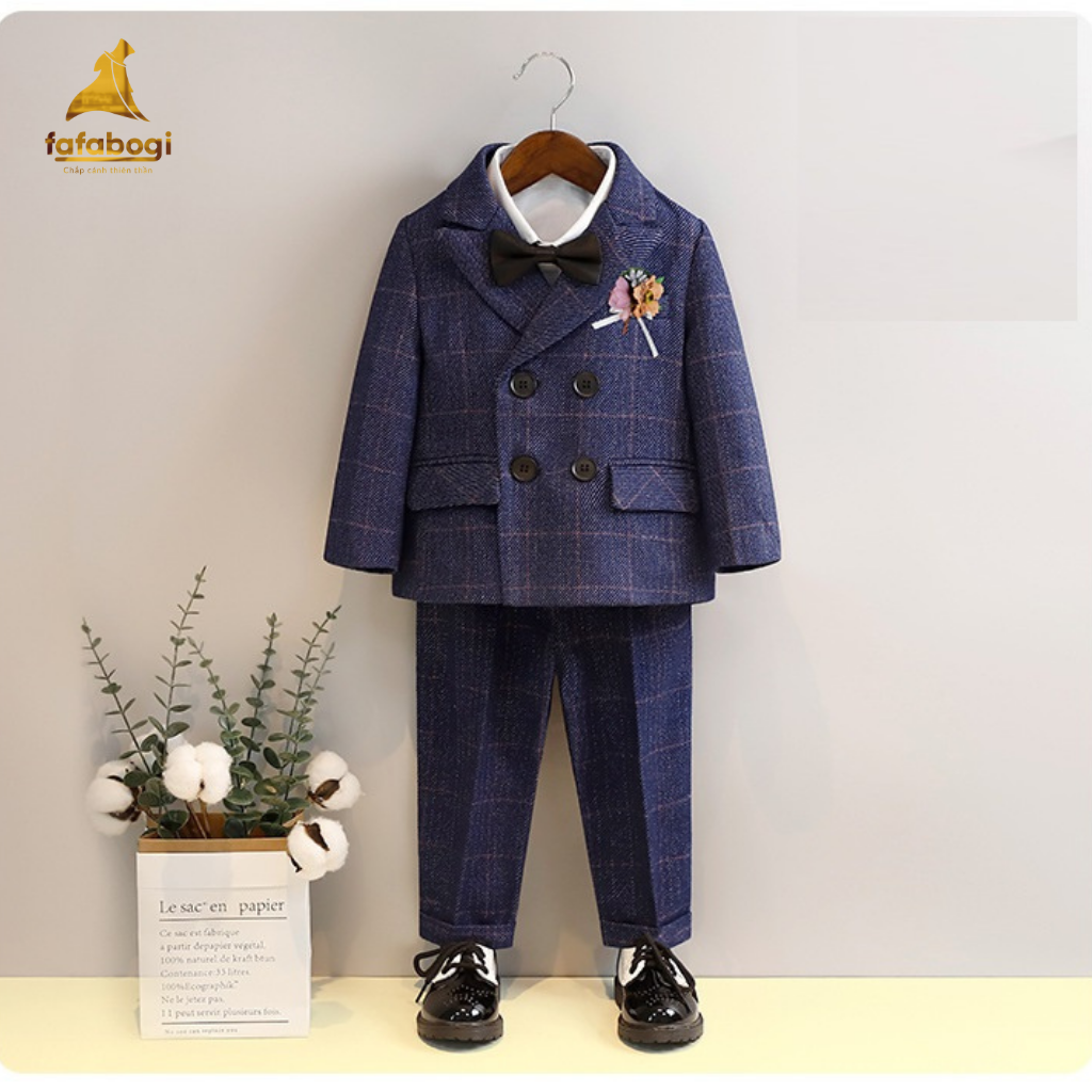 Bộ gồm 4 chi tiết: 1 áo vest + 1 Quần tây + 1 nơ + 1 hoa (Không bao gồm áo Sơ mi)