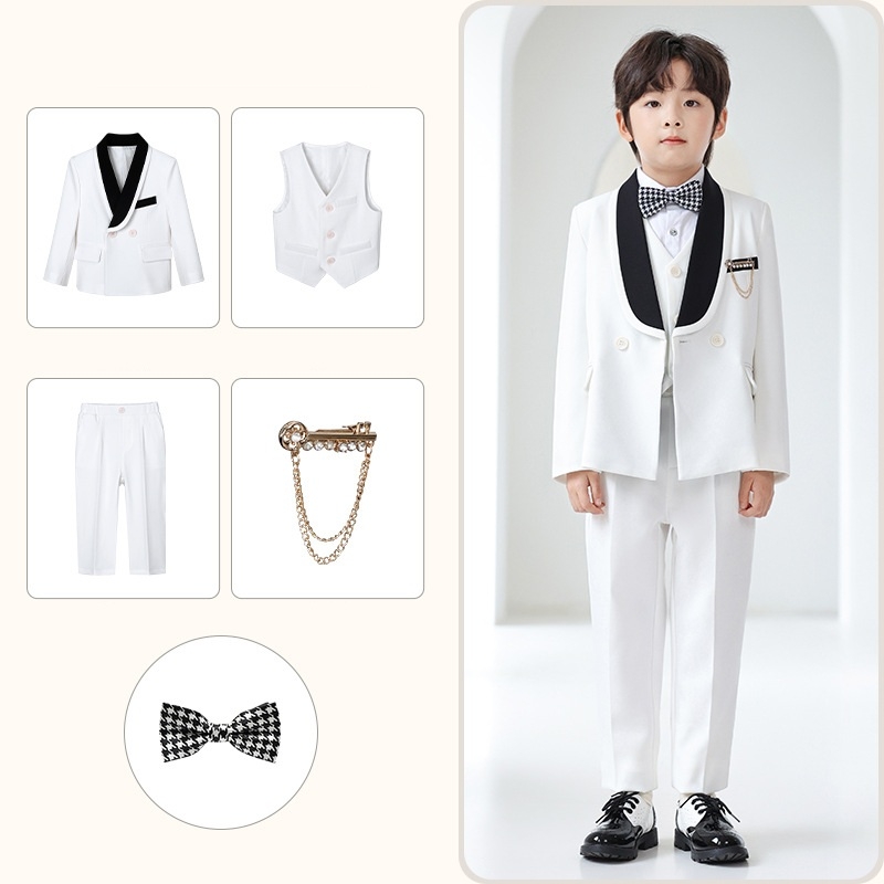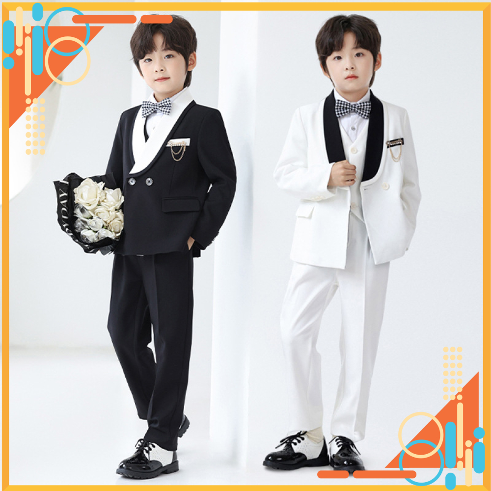 Bộ gồm 6 chi tiết : 1 áo Vest + 1 áo ghile + 1 Quần tây + 1 áo sơ mi + 1 nơ + ghim cài áo