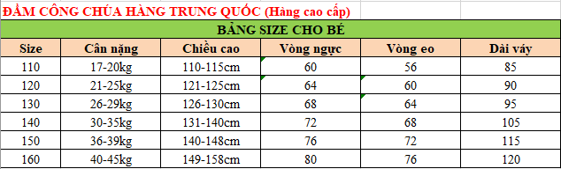 ❤️ BẢNG SIZE VÁY CÔNG CHÚA